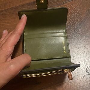 Elegant olive green set with gold-tone details. Includes wallet and card holder.