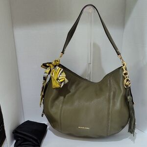 Chic olive leather hobo bag by Michael Kors. Features a stylish twilly and tassel detail. This bag is in gently used condition! It's very clean inside and out! No cracking . No smells. There is one small ink spot inside the interior. There are some small areas of discoloration on the handle. There's a small white spot on the bottom of the bag. There's a little bit of fraying on the tassel. All these areas are in the photos. Included with the bag are a twilly and unbranded dustbag. Any questions are welcomed.
