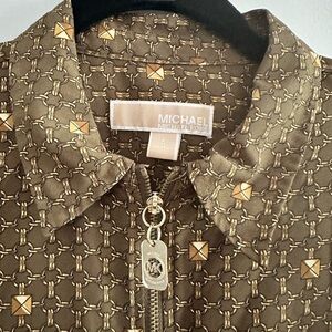 This Michael Kors blouse features a sophisticated olive hue with a subtle dotted pattern, offering a touch of elegance to your wardrobe. The collared neckline and structured shoulders add a refined touch, making it perfect for both casual and formal occasions. Crafted from a medium-weight fabric, it ensures comfort and style throughout the day.