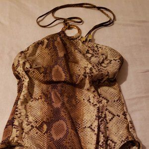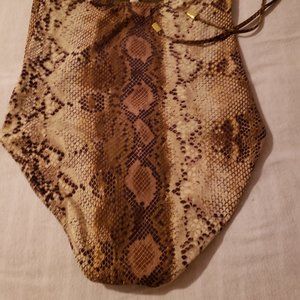This Michael Kors Cheetah print swim suit is his signature one piece! A quality swim suit,  with double stitching,  an olive-green lining and slightly padded, his name  imprinted on the center gold ring that hold the suit  ties on the clasp and, ,finished with gold block tassels. Size 4. NWOT.