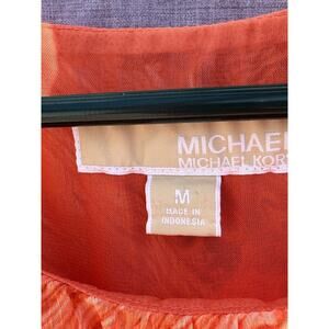 This stunning Michael Kors dress in size M is a must-have for any fashion-forward woman. The dress features an eye-catching abstract swirl pattern in bold shades of orange, making it perfect for any occasion. The short sleeve, round neck, and pullover closure make it easy and comfortable to wear, while the elastic waist and layered belt accents add a trendy touch.