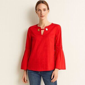 Stylish and timeless Michael Michael Kors orange bell sleeve blouse in size small. Features gold grommets at the neckline, a subtle front keyhole, and laced detailing on the sleeves for a touch of boho sophistication. The bright orange hue makes this top perfect for both casual and dressy occasions. Lightweight and flattering fit with flowy bell sleeves.