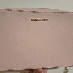 light pink michael kors (outlet) crossbody purse with gold hardware! Photos show all imperfections, but still very good condition! ABOUT 9.5 inches long, about 2 in wide and about 6in tall! Inside is open, with a pocket on each side of the interior. Interior is tan with "michael kors" print. Ask if you have questions.