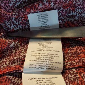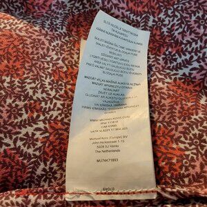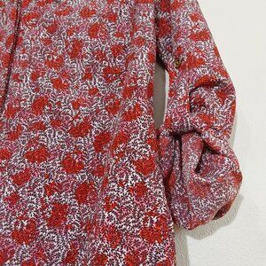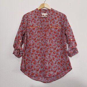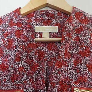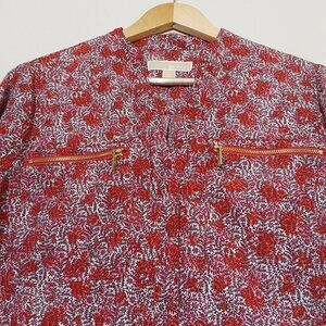 Soft, comfy blouse by Michael Kors is relaxed yet polished. Vibrant red and white floral print. Long sleeves can be rolled up and secured with tab and button closure, giving it a 3/4 sleeve appearance. V-neck with band collar and hidden button placket. Two functional chest pockets with gold-toned zipper closures. Curved hemline, slightly longer in the back. Excellent condition.