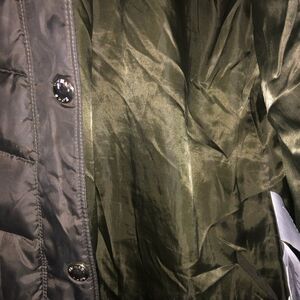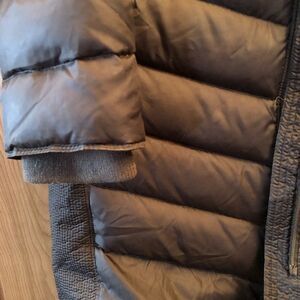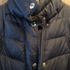Michael Kors packable down quilted jacket. Pockets with zippered closure. Full zip and snap closure. Elastic gather at back waist. Mid thigh length. Missing hood. Size Medium. Olive green. Bottom of zipper slightly torn away from material but it still works. Gold tone zipper and snaps Preowned