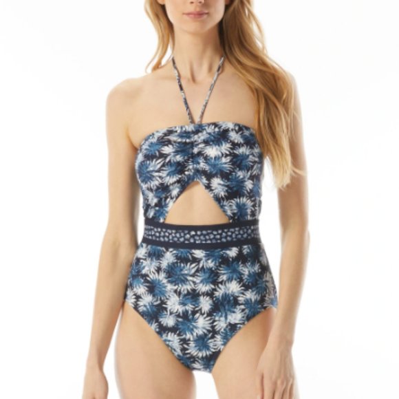 Michael Kors Palm Mix Bandeau Cutout One-Piece Swimsuit Navy Blue 8