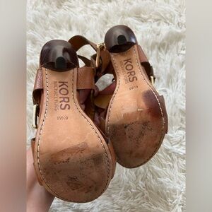 Michael Kors Paris Double Buckle - size 6.5 - luggage color - Pebble leather - sandals crisscross straps - and gold tone hardware - straps with two functioning buckles.