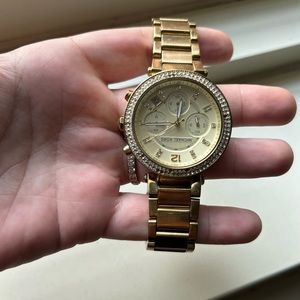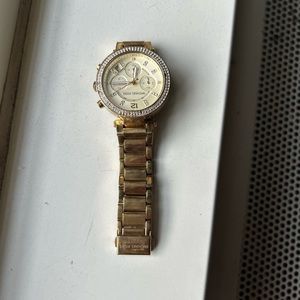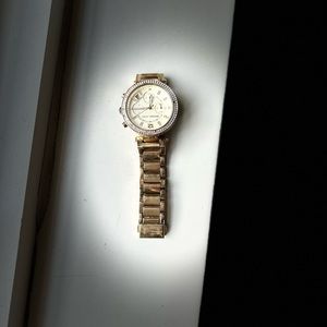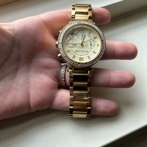 The iconic Parker watch collection by Michael Kors provide luxurious style with a modern splash of trend-right touches. Quartz movement with chronograph analog display, imported. This gold-tone 38mm stainless steel watch is an instant classic. A few of the pave’ crystals are missing which is notorious for these watches. If you bring it in to MK store scheduled they will fix! Great condition other than that. D/O available for local Brooklyn. shipping available. Bundle encouraged!