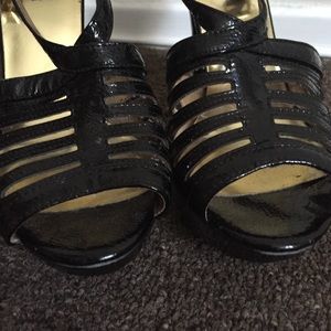 Michael Kors Patent Leather Peeptoe heel. 5in with platform. Not a new shoe but in ok condition. Lightly scuffed in the front. Rubber sole and comfortable