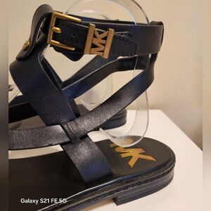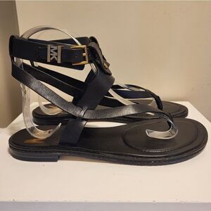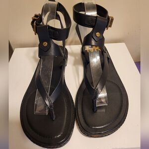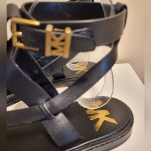 Michael Kors "Pearson" Black Leather Strappy Sandals Gold Accents