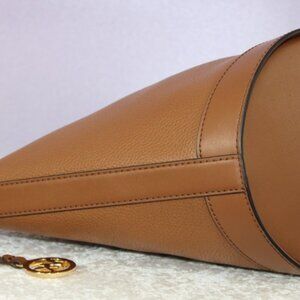 Classic and elegant Michael Kors matching set featuring a pebbled leather bucket bag with adjustable crossbody strap and coordinating zip-around continental wallet. Both pieces are crafted in the beautiful Acorn brown color with gold-tone MK hardware. The bag has a spacious interior with a zip pocket, slip pockets, and light MK signature lining.