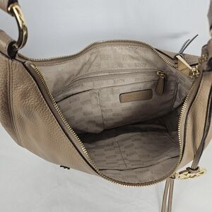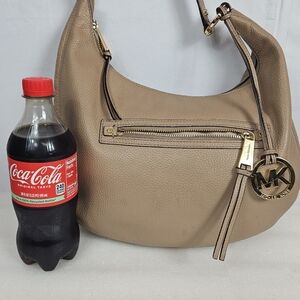 This high quality bag is made by Michael Kors. It features tan leather with gold MK,Lydia oyster hobo style, interior has one back zip pocket, 2 back slit pockets and 6 front slit pockets. top zip closure, exterior back slip pocket . It is approximately 15 inches wide by 11 inches high by 2.5 inches deep, strap has a 10.5" drop. It is gently used with no damage as pictured. pictured with Coca-Cola to show actual color