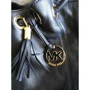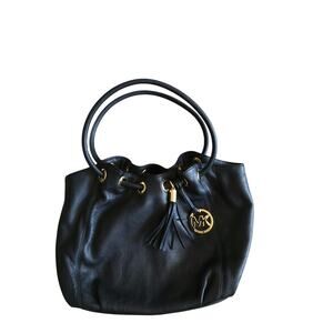 Designer Michael Kors classy chic black pebbled leather drawstring purse bag has a gorgeous tassel and pristine condition no stains, or damages NWOT. 14 x 11 inches. Gold accents. Coachella, old money,