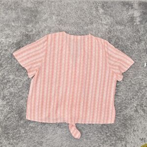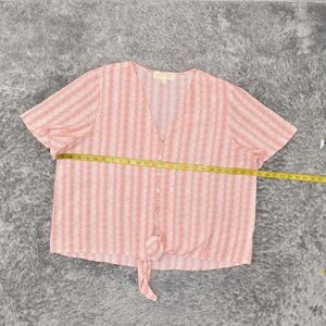 Chic pink top with button-down front. Short sleeves and tie detail. Perfect for casual wear.