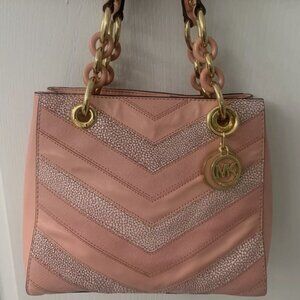 It has chain straps but comes with a detachable cross-body strap, making it versatile and easy to wear. The pink leather handles and straps are accented with gold hardware, adding a touch of glamour to the bag. This Michael Kors Cynthia Satchel is truly a statement piece that will elevate any outfit.