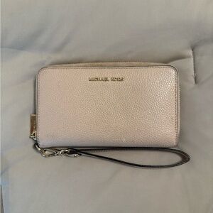 This Michael Kors clutch in a soft cream hue is crafted from pebbled leather, offering a sophisticated and timeless look. Its compact design with a wrist strap makes it an ideal accessory for carrying essentials with ease. The gold-tone logo adds a touch of elegance to this classic piece.