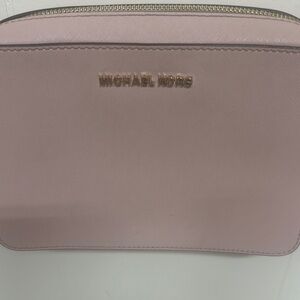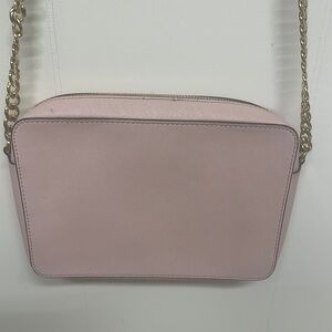 The Michael Kors crossbody bag in a charming pink shade showcases a sleek, structured silhouette, complemented by a gold chain and leather strap. Its minimalist design and versatile color make it a perfect accessory for any occasion. See all photos as they are part of description