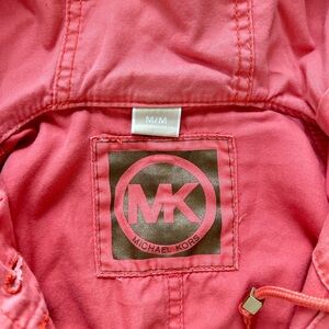 Cute salmon pink hooded jacket. Has internal drawstring to emphasize waist, size Medium. Great condition! Has a small pinprick hole in the sleeve, barely visible as shown in the last picture