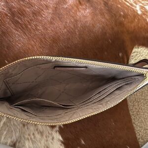 This Michael Kors clutch wristlet showcases a sophisticated pink monogram design, perfect for adding a touch of elegance to your ensemble. Crafted from durable materials, it features a sleek rectangular shape ideal for carrying essentials. The metallic zipper closure adds a modern touch, making it a stylish accessory for any occasion.