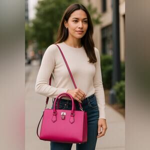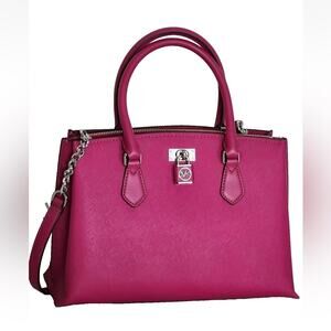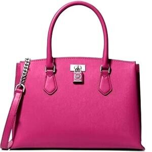 Stylish pink satchel with silver accents. Features dual handles and a detachable strap. Iconic Michael Kors logo on the front.