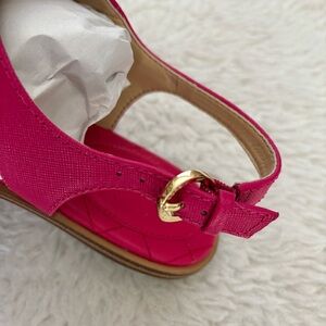 These Michael Kors sandals feature a vibrant pink T-strap design, complemented by elegant gold-tone hardware. The flat sole and suede-like material ensure comfort and style, making them perfect for warm weather outings. The light cream footbed adds a subtle contrast, enhancing the overall minimalist aesthetic. Please check pictures for details and good condition.