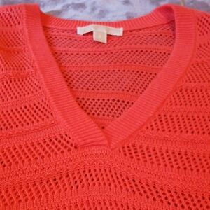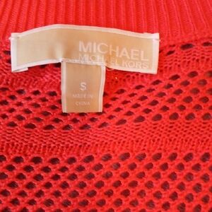 This Michael Kors sweater showcases a vibrant pink color with a classic V-neck design, ideal for layering. The lightweight knit and ribbed texture offer a stylish and comfortable fit, perfect for any season. See photos for details.