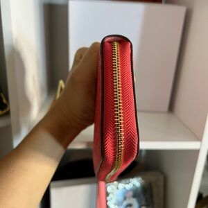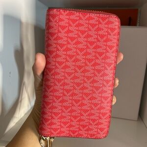 This elegant Michael Kors wallet in a vibrant pink hue is designed for both style and convenience. Featuring gold-tone hardware and a signature MK logo pattern, it offers a sophisticated touch to any ensemble. Perfect for carrying essentials, this wristlet combines functionality with a chic aesthetic.