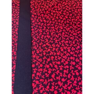 sift and silky feel, drapes beautifully. V neck and sleeveless., some gathering at the neck with elastic. Dark Pink background with floral motif and navy detail down front.