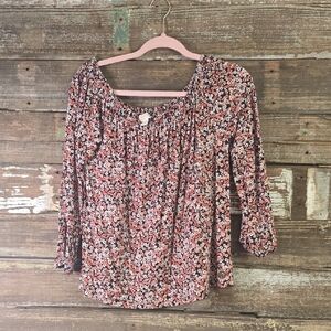 This relaxed blouse from Michaels features a charming smocked detail around the neckline and a delightful floral pattern in pink and red. The 3/4 sleeves with gathered cuffs add a touch of elegance, making it perfect for casual spring or summer outings.