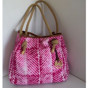 Stylish pink and white tote. Features rope handles. Iconic MK charm detail.