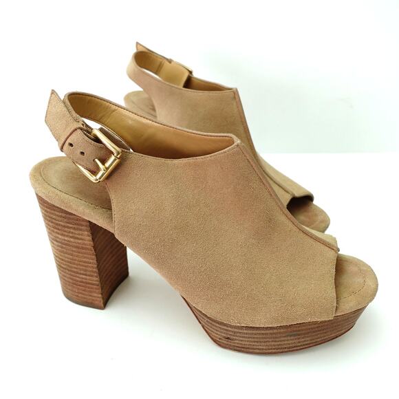 Michael Kors Piper Platform Tan Suede Peep Toe Block Heel Sandals Size 10