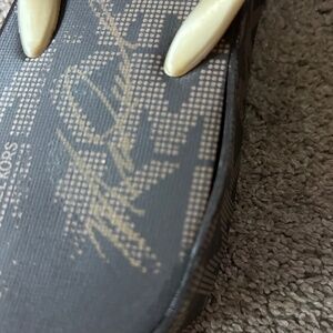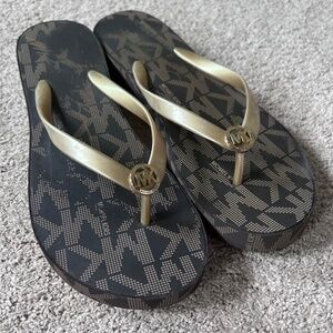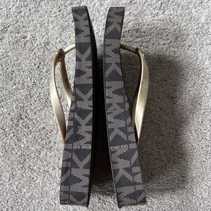 Brown with Michael Kors logo over entirety of each flip-flop with gold straps and the Michael Kors logo on the straps