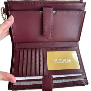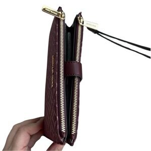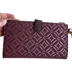 Michael Kors wristlet in a deep plum shade. Features elegant pattern and gold-tone accents. Ideal for versatile use with a handy wrist strap.