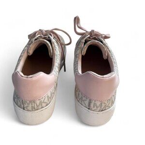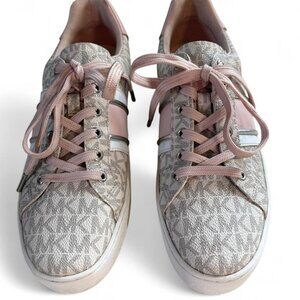 Design & Features: They feature the signature Michael Kors logo print on canvas, accented with a pink stripe and a rubber sole. They have a lace-up closure and a round toe.