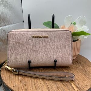 Michael Kors Powder Blush Jet Set Travel Flat Leather Pebbled Wristlet Wallet