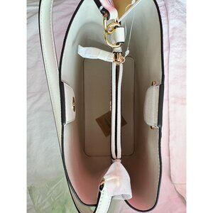 New with tags, This elegant bucket bag combines timeless design with functional versatility. Crafted from premium leather, it features a sleek logo stripe and ample interior space for organization. Its pale gold tone adds sophistication, making it a refined accessory for professional settings or day-to-day use.