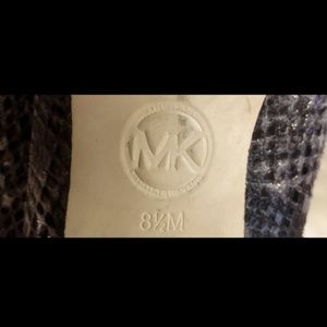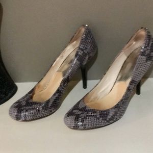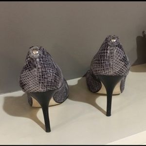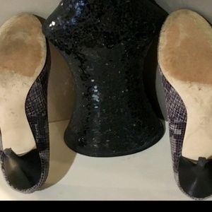 Round tie, grey and black exotic Print heels! In gently used condition. Size 8 1/2