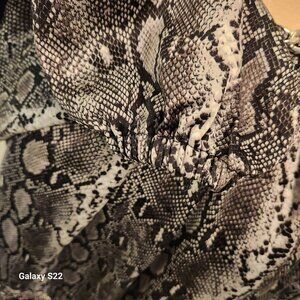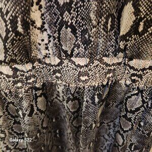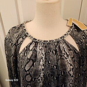 Michael Kors Print/Silver chain detailed dress. NWT. Size 3 X. Colors are black, grey and white. Snake print look. Silver tone chain hardware. No rips/stains/tears/pulls. No flaws. Long sleeve. Zips down back to waist area. Measurements: Pit to Pit: 26 inches. At waist: 21.5 inches, has a stretch band. Top of shoulder to bottom: 40 inches. Not a lightweight dress, medium weight. Material: Poly/Recycled Poly Mix. Silky feel. Smoke free home. No odors. All offers are welcome. Thank you!! Retail: 185, on sale for 62.