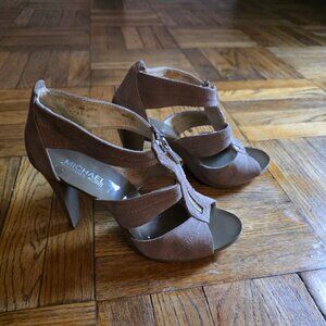 Michael Kors Taupe Suede Berkeley T-Strap Peep Toe Zip up Pumps 7