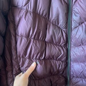 Stylish puffer down jacket by Michael Kors. Features a rich purple color. Perfect for cold weather. Has a small hole above left size pocket pictured