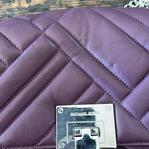 This elegant shoulder bag from Michael Kors features a rich purple hue and a sophisticated quilted design. The gold-toned chain strap and clasp add a touch of luxury, making it a perfect accessory for any occasion.
