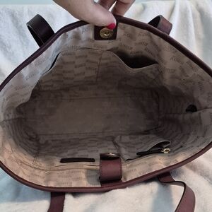 Michael Kors plum purple with gold studs clasp closure tote purse. Measures 10 1/8" H x 3 3/4" D x 12" W at base 16 W" at top. 4 interior pockets plus a zip closure pocket. Exterior pocket on the back for quick access to cell phone. Used only once and has been sitting in my closet and it's ready to find a new home.