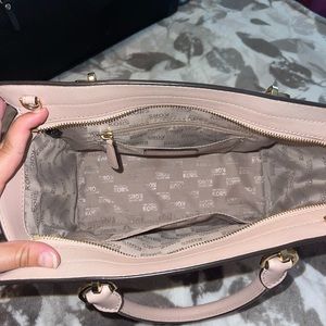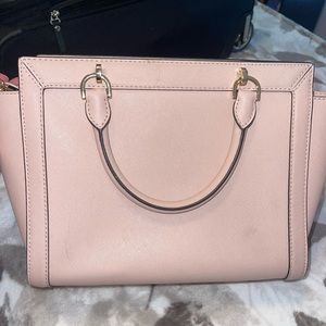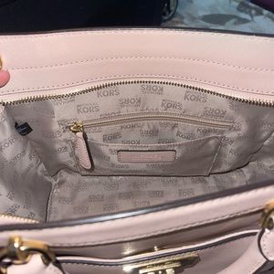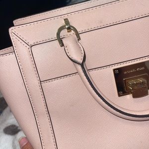 Light baby pink Michael Kors purse with removable long strap. On the smaller size but lots of great space. Signs of wear including scuffs and scratches on the hardware please see photos. Been kept in a dust bag in a closet and a smoke free home.