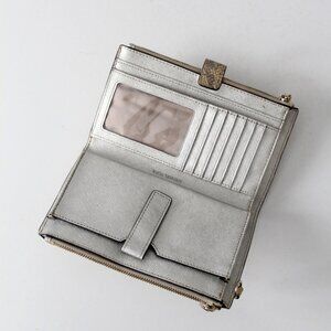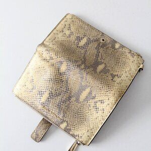 This is a Michael Kors wallet from the Jet Set Collection in metallic gold python-embossed leather. Classic mid-2010s style featuring a snap tab closure, zip-around coin pocket, and organized interior with card slots, bill compartments, and an ID window. Finished with gold-tone hardware and the signature Michael Kors logo at the front. Chic, versatile, and perfect for adding a touch of shine to any bag.