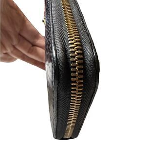 Used condition. Exterior has some markings. Gold plate and zipper are scratched or faded. Zipper works great. Interior zipper pull is missing. 8 card slots. Coin zipper pouch.4 open slots.