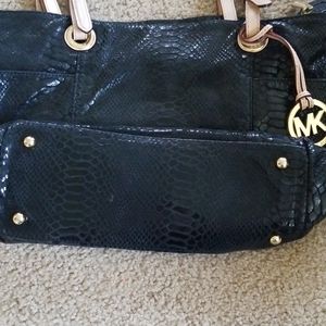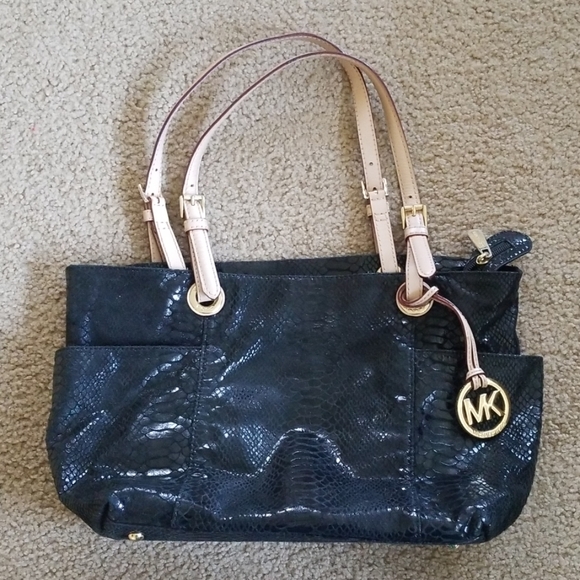 Michael Kors python-embossed leather top zip tote. Item condition is like new. This item is in excellent condition aside from hard to notice, very slight signs of wear on gold hardware. Featured two pockets on the side, a roomy inside with MK signature print, and zipper compartment along with 4 open-air compartments with the python emboss inside. The bag has a cool texture to the touch. Soft and comfortable on the shoulder.
