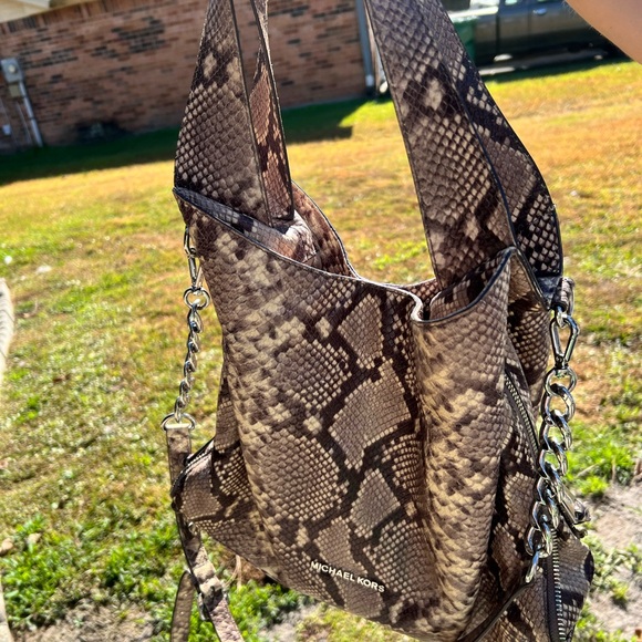 Stylish Michael Kors bag with a striking python pattern. Features a sleek chain strap for added elegance. Perfect for any occasion.