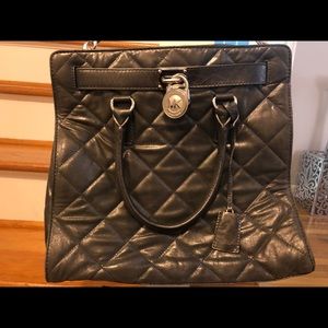 Large grey quilted tote with silver accents, and crossbody strap. Perfect for work, travel or everyday. Large enough to fit a laptop.