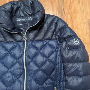 Excellent condition Michael Kors quilted packable down full-zip puffer coat / jacket. Two tone shades of navy blue. Features beautiful MK silver hardware. Super lightweight but designed to keep you warm. Down filled coat designed to pack away compactly for travel and keep you warm.