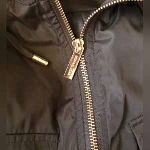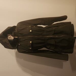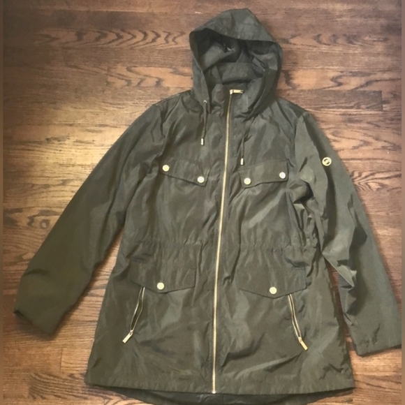 Beautiful Michael Kors Olive green rain jacket in size Large. Gold accents. Slightly tapered in back with hoodie. Pairs well with jeans and casual shirt or business casual. SOLD OUT online.